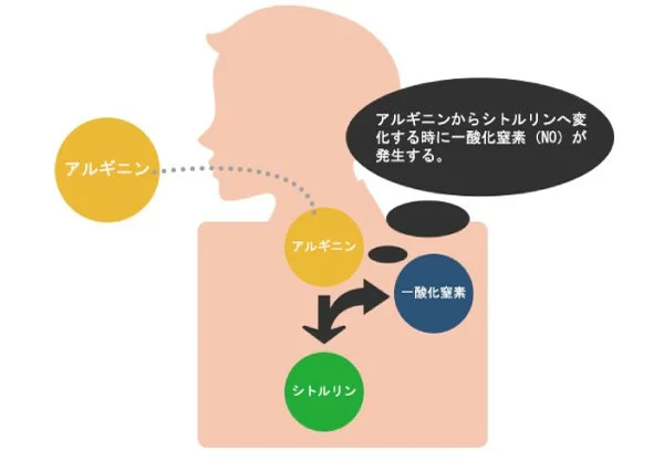 アルギニンは、体内の一酸化窒素(NO)産生を高める役割を持ちます。アルギニンにより体内でNOの産生が高まると、血管が拡張され動脈が柔軟になり、血流が促進します。